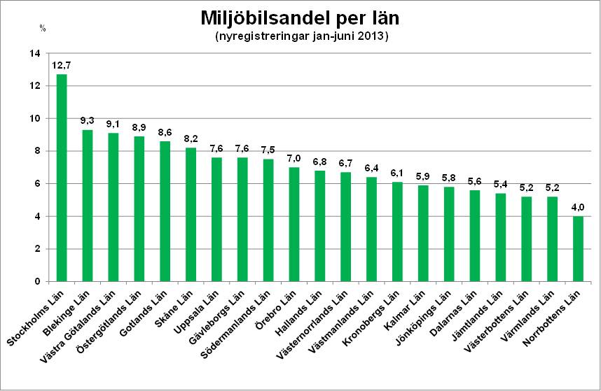 - Stockholms län har den högsta miljöbilsandelen av nybilsregistreringarna under första halvåret i år. Den skärpta miljöbilsdefinitionen från årsskiftet har inneburit att betydligt färre modeller än tidigare kvalar in som miljöbilar. I riket som helhet är en av tio nya bilar hittills i år en miljöbil enligt den nya miljöbilsdefinitionen jämfört med fyra av tio samma period förra året enligt den gamla definitionen, fortsätter Bertil Moldén.