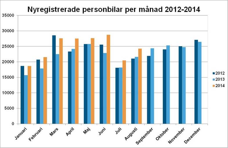 Under augusti registrerades 24 274 nya personbilar, vilket är en ökning med 12,3 % jämfört med samma månad förra året. Hittills i år, januari-augusti har registreringarna ökat med 16,5 %. Lastbilsregistreringarna totalt ökade med 5,1 % under augusti till 3 596. Hittills i år har lastbilsregistreringarna ökat med 11,7%. Lätta lastbilar upp till 3,5 ton ökade i augusti med 3,8 % och tunga lastbilar över 16 ton ökade med 19,1 %. Hittills i år har lätta lastbilar ökat med 11,3 % och tunga lastbilar har ökat med 17,2 %.