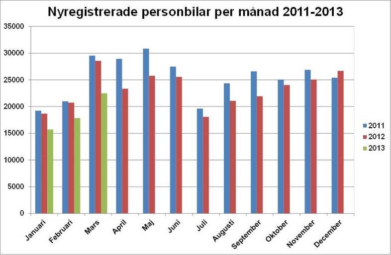 Antalet nyregistrerade supermiljöbilar, dvs bilar med koldioxidutsläpp på max 50 g/km, uppgick till 176 st i mars i år och jan-mars i år till 590 st. Under helåret 2011 nyregistrerades 181 supermiljöbilar och under 2012 nyregistrerades 928 st, vilket innebär att det hittills, från januari 2011 t.o.m. mars i år registrerats