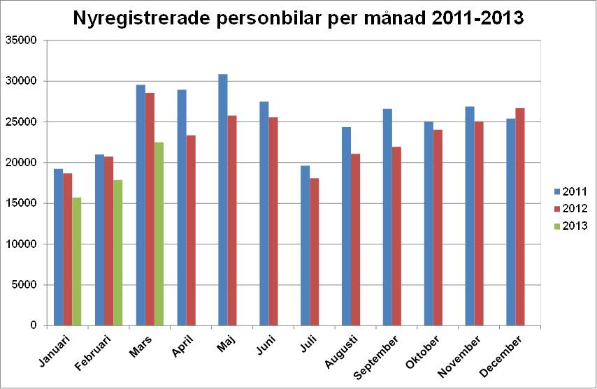 Under mars registrerades 22 493 nya personbilar, vilket är en minskning med 21,2 % jämfört med samma månad förra året. Hittills i år, januari-mars, har registreringarna minskat med 17,5%. Lastbilsregistre-ringarna totalt minskade med 14,7% under mars till 3 764. Hittills i år har lastbilsregistreringarna minskat med 9,4 %. Lätta lastbilar upp till 3,5 ton minskade i mars med 12,0% och tunga lastbilar över 16 ton minskade med 35,7 %. Hittills i år har lätta lastbilar minskat med 7,0 % och tunga lastbilar har minskat med 27,3 %.