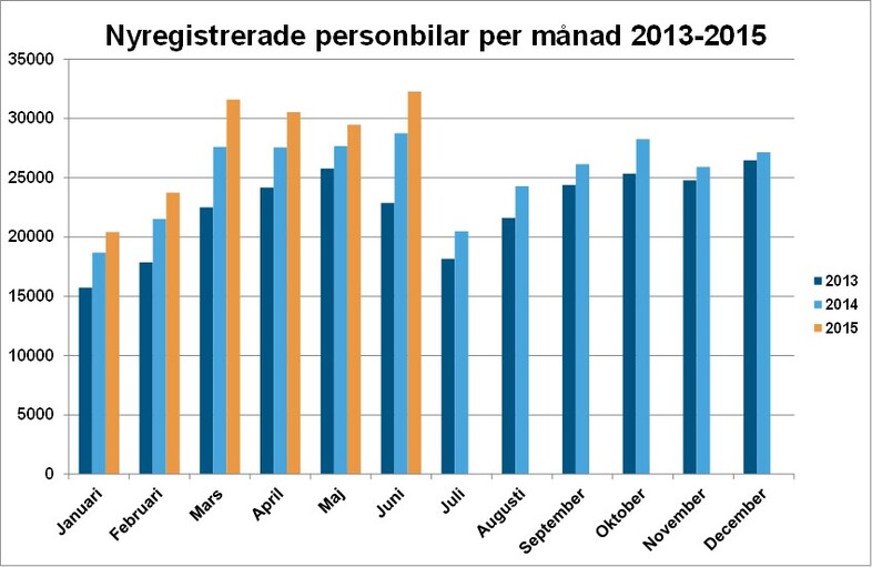 Under juni registrerades 32 257 nya personbilar, vilket är en ökning med 12,2 % jämfört med samma månad förra året. Hittills i år, januari-juni, har registreringarna ökat med 10,7%. Lastbilsregistreringarna totalt ökade med 13,1% under juni till 4 456. Hittills i år har lastbilsregistreringarna ökat med 7,0%. Lätta lastbilar upp till 3,5 ton ökade i juni med 14,4 % och tunga lastbilar över 16 ton minskade med 2,0 %. Hittills i år har lätta lastbilar ökat med 8,1 % och tunga lastbilar har minskat med 3,3 %.
