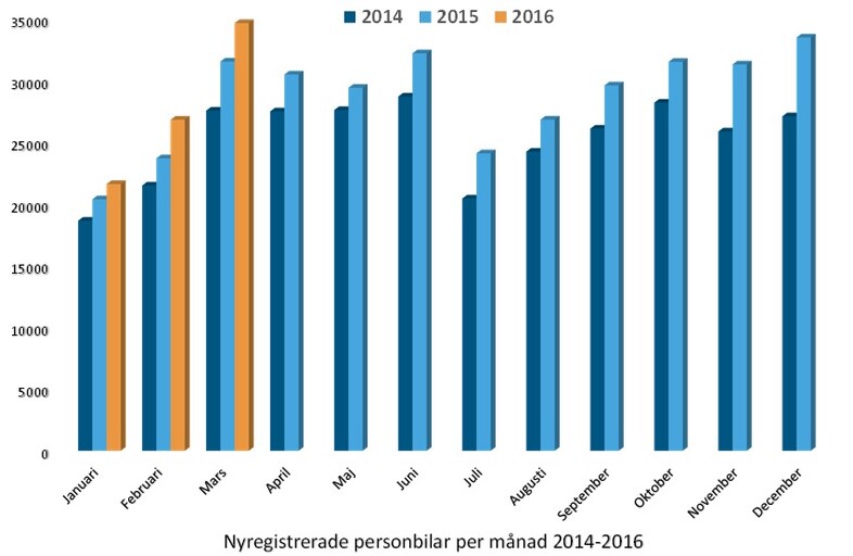 Under mars registrerades 34 712 nya personbilar, vilket är en ökning med 9,9% jämfört med samma månad förra året. Hittills i år, januari-mars, har registreringarna ökat med 9,9%. Lastbilsregistreringarna totalt ökade med 10,5% under mars till 5 181. Hittills i år har lastbilsregistreringarna ökat med 16,3%. Lätta lastbilar upp till 3,5 ton ökade med 10,5% och tunga lastbilar över 16 ton ökade med 14,2%. Hittills i år har lätta lastbilar ökat med 16,1% och tunga lastbilar har ökat med 19,2%.