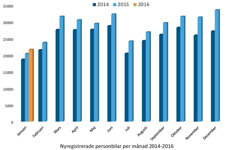 Under januari registrerades 21 648 nya personbilar, vilket är en ökning med 6,1 % jämfört med samma månad förra året. Lastbilsregistreringarna totalt ökade med 12,5 % under januari till 3 221. Lätta lastbilar upp till 3,5 ton ökade med 11,5 % och tunga lastbilar över 16 ton ökade med 13,9 %.