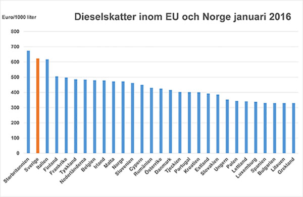 Nyligen utkom ACEA Tax Guide för 2016, som jämför skatter på vägtrafik i olika länder. Sverige har nu världens näst högsta dieselskatt och världens femte högsta bensinskatt, efter höjningen vid senaste årsskifte.
