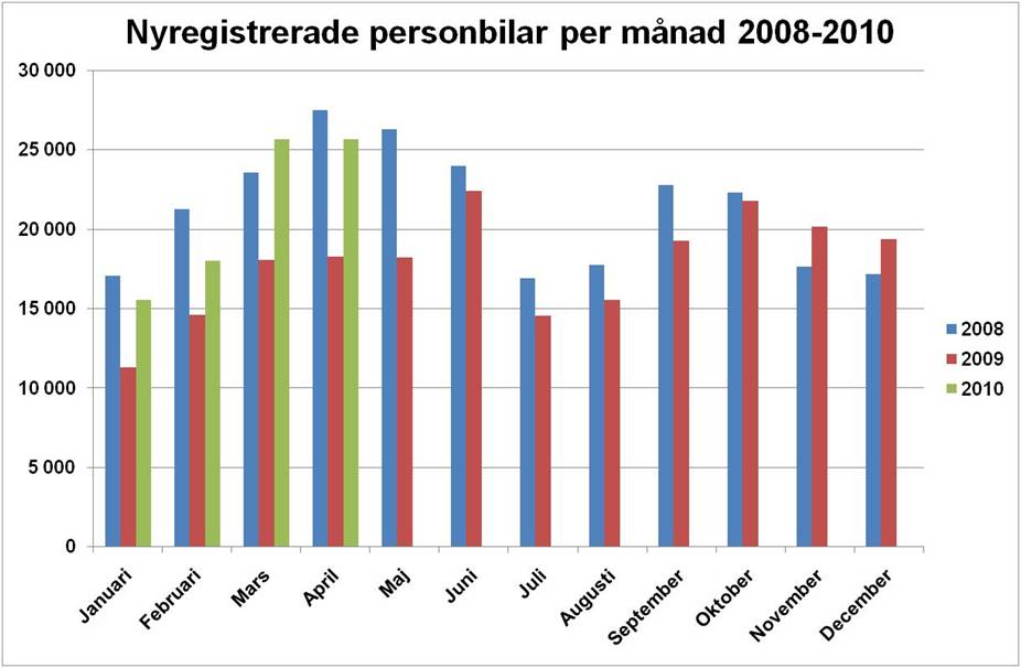 Under april registrerades 25 668 nya personbilar, vilket är en ökning med 40,7% jämfört med samma månad förra året. Hittills i år, januari-april, har registreringarna ökat med 36,4 %. Lastbilsregistreringarna totalt ökade med 27,7 % under april till 3 672. Hittills i år har lastbilsregistreringarna ökat med 14,0 %. Lätta lastbilar upp till 3,5 ton ökade i april med 42,6 % och tunga lastbilar över 16 ton minskade med 29,3 %. Hittills i år har lätta lastbilar ökat med 26,1 % och tunga lastbilar har minskat med 35,8 %.