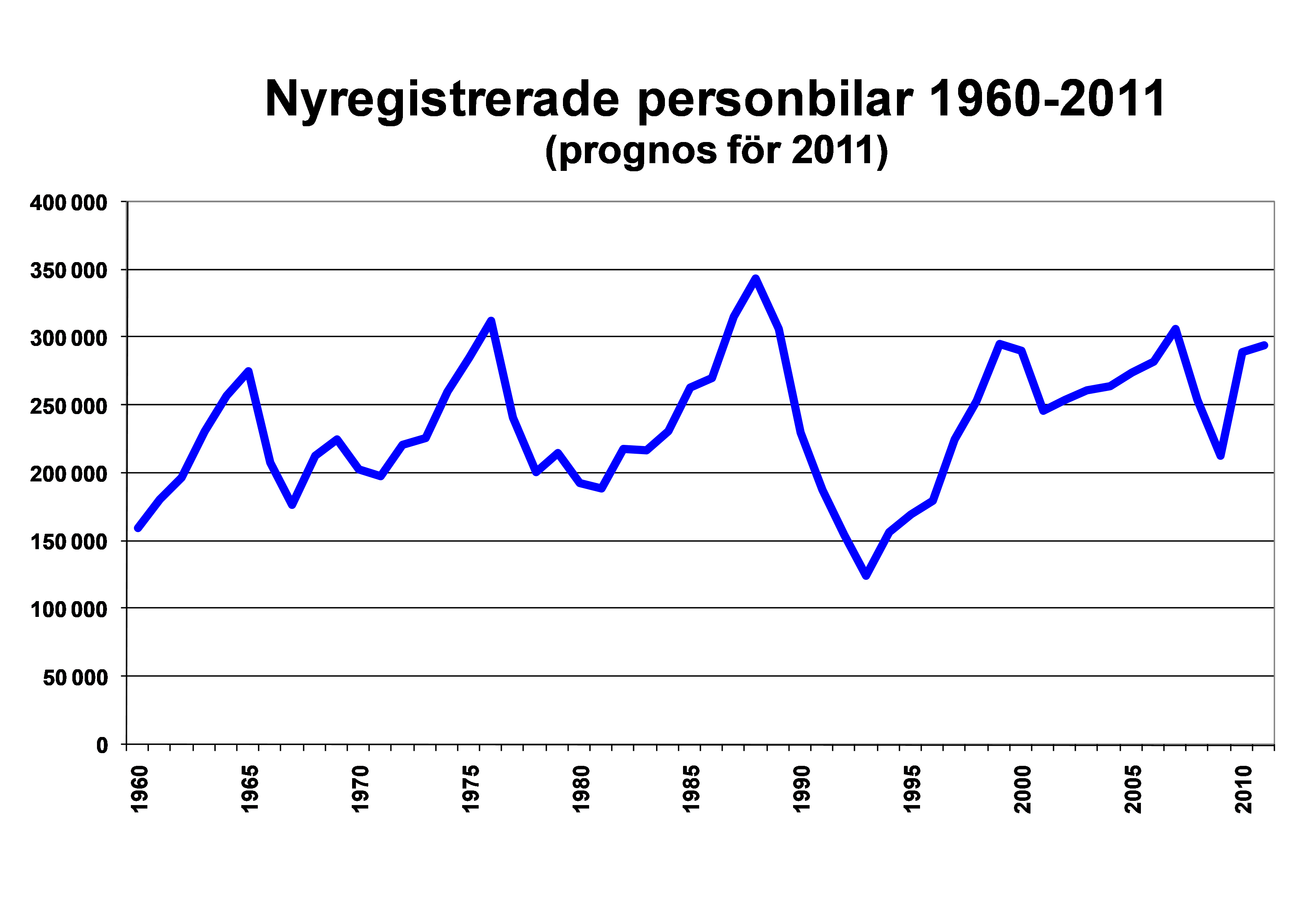 Detta i sin tur gör att vår prognos landar högre än förra året – nämligen 295 000 personbilar för 2011 samt 42 000 lätta lastbilar, avslutar Bertil Moldén.