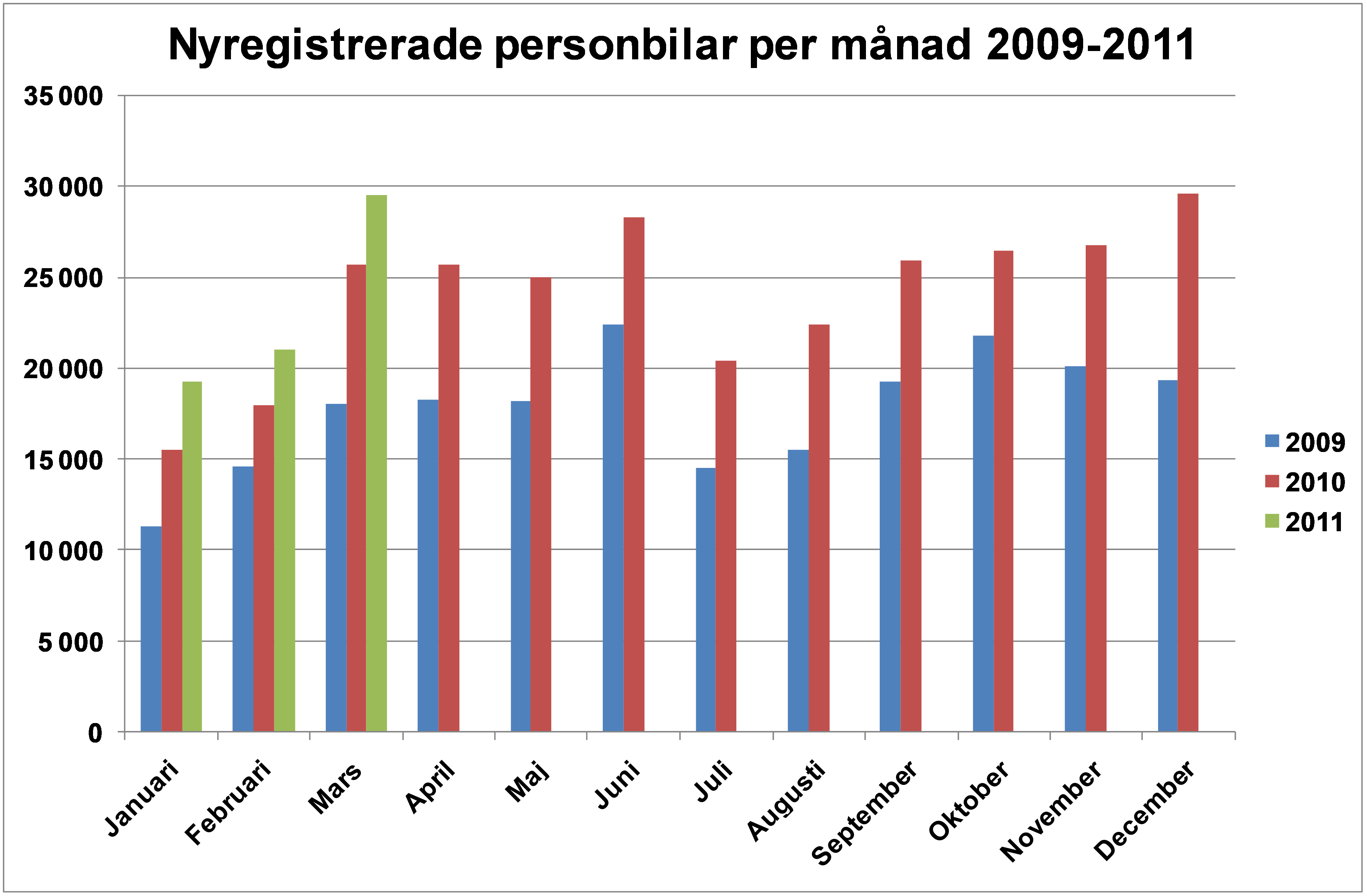 Under mars registrerades 29 527 nya personbilar, vilket är en ökning med 15,1 % jämfört med samma månad förra året. Hittills i år, januari-mars, har registreringarna ökat med 18,0 %. Lastbilsregistreringarna totalt ökade med 29,7 % under mars till 4 789. Hittills i år har lastbilsregistreringarna ökat med 35,0 %. Lätta lastbilar upp till 3,5 ton ökade i mars med 29,5 % och tunga lastbilar över 16 ton ökade med 35,7 %. Hittills i år har lätta lastbilar ökat med 36,0 % och tunga lastbilar har ökat med 34,6 %.