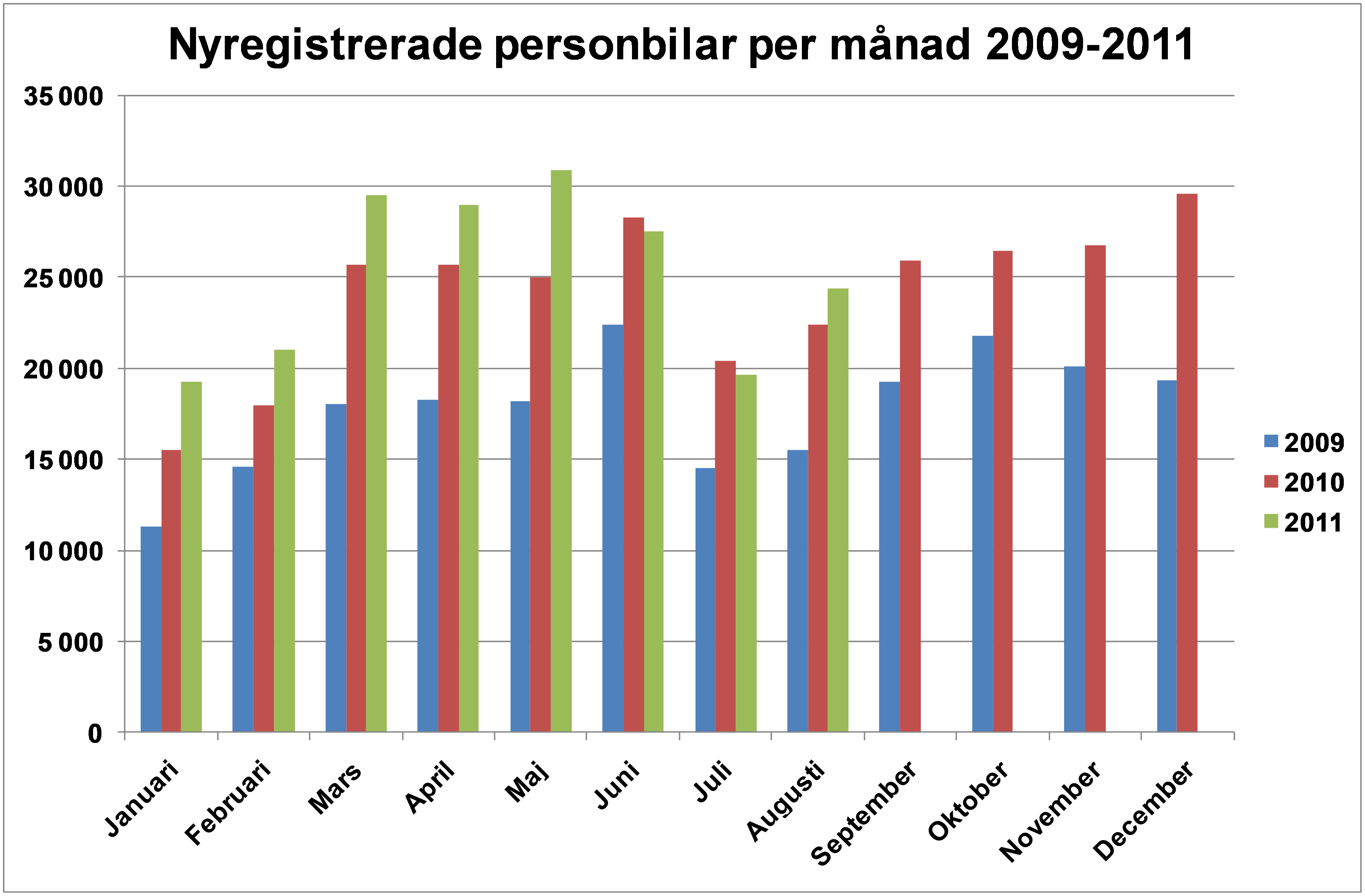 Under augusti registrerades 24 368 nya personbilar, vilket är en ökning med 8,9 % jämfört med samma månad förra året. Hittills i år, januari-augusti, har registreringarna ökat med 11,2%. Lastbils-registreringarna totalt ökade med 35,0 % under augusti till 4 432. Hittills i år har lastbilsregistreringarna ökat med 27,0 %. Lätta lastbilar upp till 3,5 ton ökade i augusti med 34,2 % och tunga lastbilar över 16 ton ökade med 45,8 %. Hittills i år har lätta lastbilar ökat med 26,8 % och tunga lastbilar har ökat med 30,9 %.