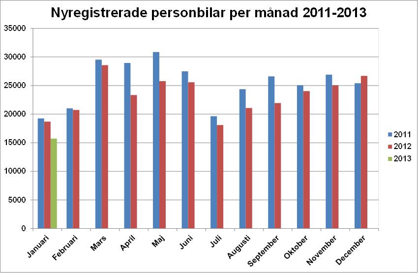 Under januari registrerades 15 721 nya personbilar, vilket är en minskning med 15,9 % jämfört med samma månad förra året. Lastbilsregistreringarna totalt minskade med 4,7 % under januari till 2 929. Lätta lastbilar upp till 3,5 ton minskade i januari med 3,1 % och tunga lastbilar över 16 ton minskade med 15,9 %.