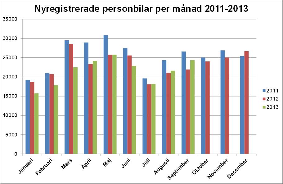 Antalet nyregistreringar av miljöbilar under september uppgick till 2 206 och miljöbilsandelen till 9,0 % enligt den nya skärpta miljöbilsdefinitionen som gäller från 1 januari 2013. Antalet nyregistrerade miljöbilar i september förra året enligt den gamla miljöbilsdefinitionen, som gällde t.o.m. 2012, uppgick till 10 258 och miljöbilsandelen till 46,8 %. Hittills i år ligger miljöbilsandelen på 9,4 % enligt den nya definitionen, jämfört med 44,2 % samma period förra året enligt den gamla definitionen.